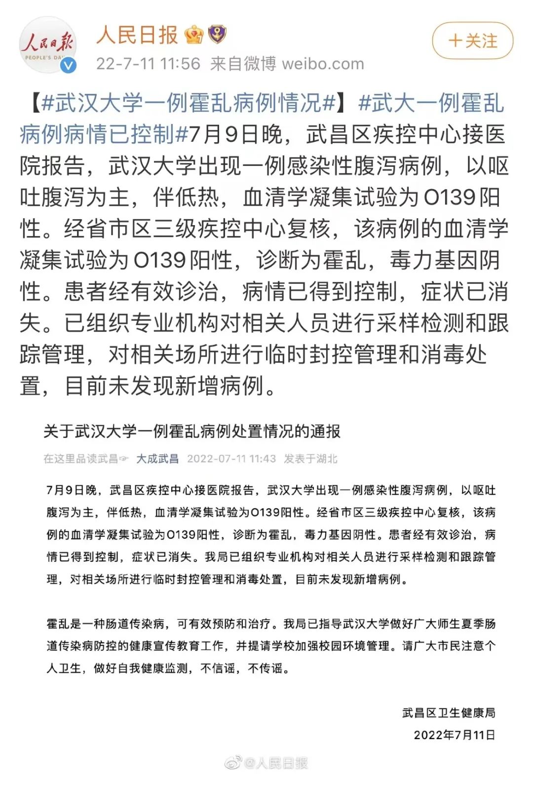 日前,湖北省武汉市武昌区卫生健康局通报:7月9日晚,武昌区疾控中心接医院报告,武汉大学出现一例感染性腹泻病例。经省市区三级疾控中心复核,诊断为霍乱。目前,患者经有效诊治,病情已得到控制,症状已消失。